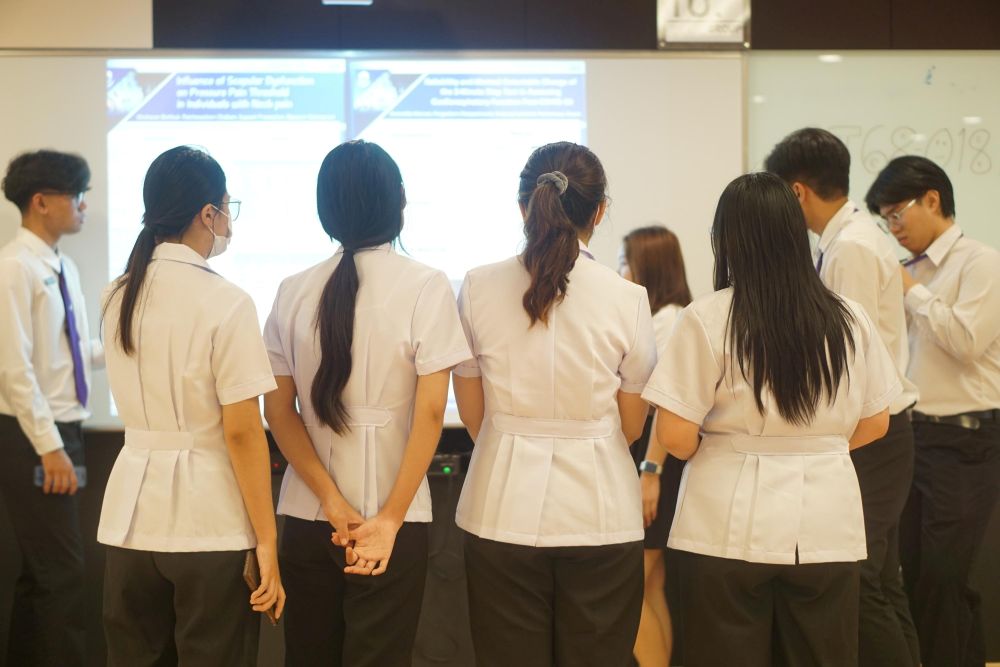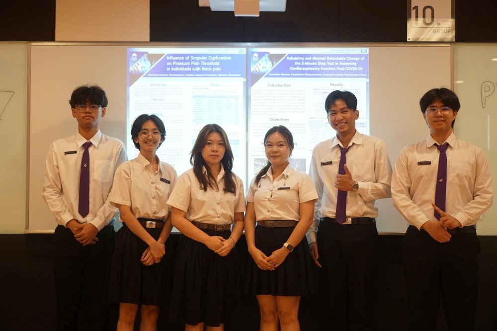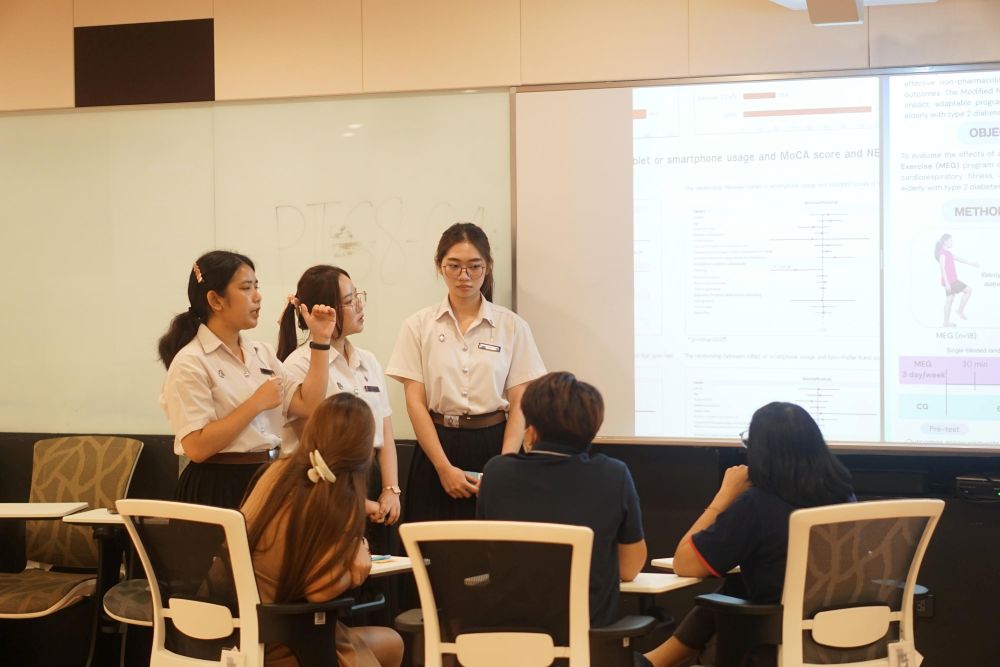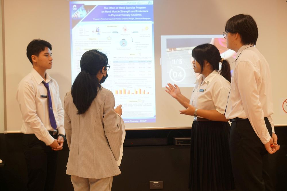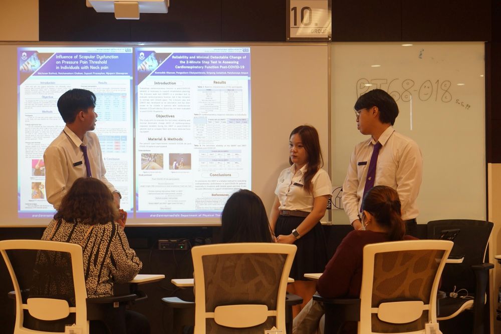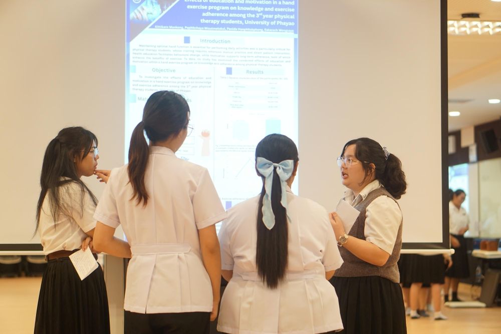 นิสิตกายภาพบำบัด มหาวิทยาลัยพะเยา เข้าร่วมโครงการนำเสนองานวิชาการรูปแบบโปสเตอร์ เมื่อวันที่ 25 กันยายน 2568 ณ ห้อง Active Learning มหาวิทยาลัยพะเยา นิสิตสาขากายภาพบำบัด ได้เข้าร่วมกิจกรรม โครงการนำเสนองานวิชาการรูปแบบโปสเตอร์ เพื่อเป็นเวทีแสดงศักยภาพทางวิชาการและการวิจัยของนิสิต โดยมุ่งเน้นการ บูรณาการความรู้ทางกายภาพบำบัด สู่การสร้างสรรค์ผลงานวิจัยและนวัตกรรมที่สามารถนำไปประยุกต์ใช้ในการแก้ปัญหาสุขภาพของบุคคลและชุมชน การจัดงานในครั้งนี้สะท้อนให้เห็นถึงการเรียนรู้ที่เชื่อมโยงระหว่างทฤษฎีและการปฏิบัติจริง อันสอดคล้องกับปรัชญาการจัดการศึกษา “ประสบการณ์สร้างปัญญา” (True Wisdom Springs From Lived Experiences) ที่มหาวิทยาลัยพะเยายึดถือเป็นแนวทางสำคัญ เพื่อพัฒนาศักยภาพของนิสิตให้ก้าวสู่การเป็นนักวิชาชีพที่มีความรู้คู่คุณธรรม สามารถนำความรู้ทางวิชาการไปสู่การสร้างคุณค่าให้แก่สังคมได้อย่างแท้จริง บรรยากาศการนำเสนอเต็มไปด้วยความกระตือรือร้นและการแลกเปลี่ยนเรียนรู้เชิงวิชาการระหว่างคณาจารย์และนิสิต ซึ่งไม่เพียงเสริมสร้างทักษะการคิดวิเคราะห์และการสื่อสารเชิงวิชาการ แต่ยังเป็นการวางรากฐานสำคัญสำหรับการพัฒนาต่อยอดงานวิจัยหรือนวัตกรรมทางกายภาพบำบัดในอนาคต