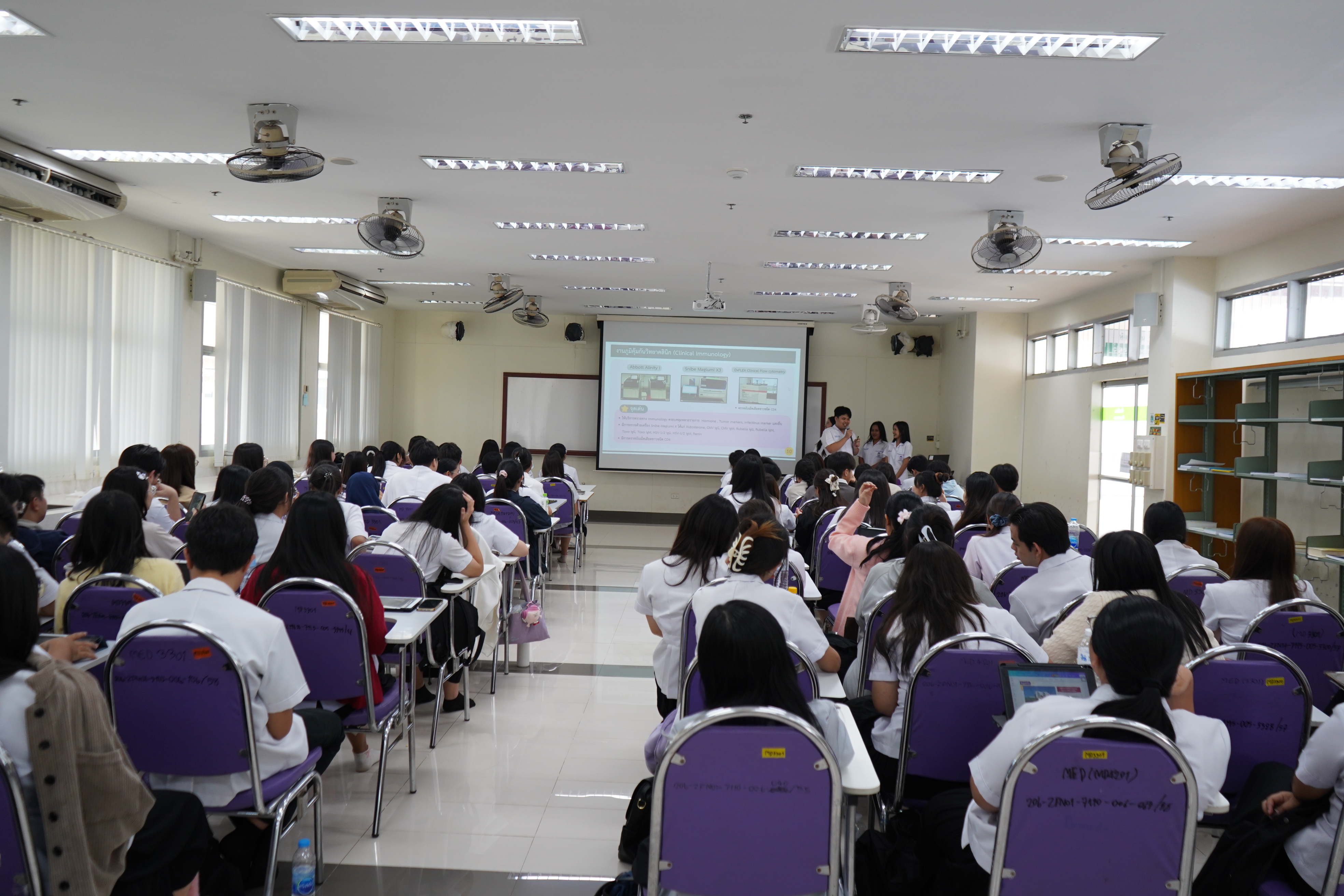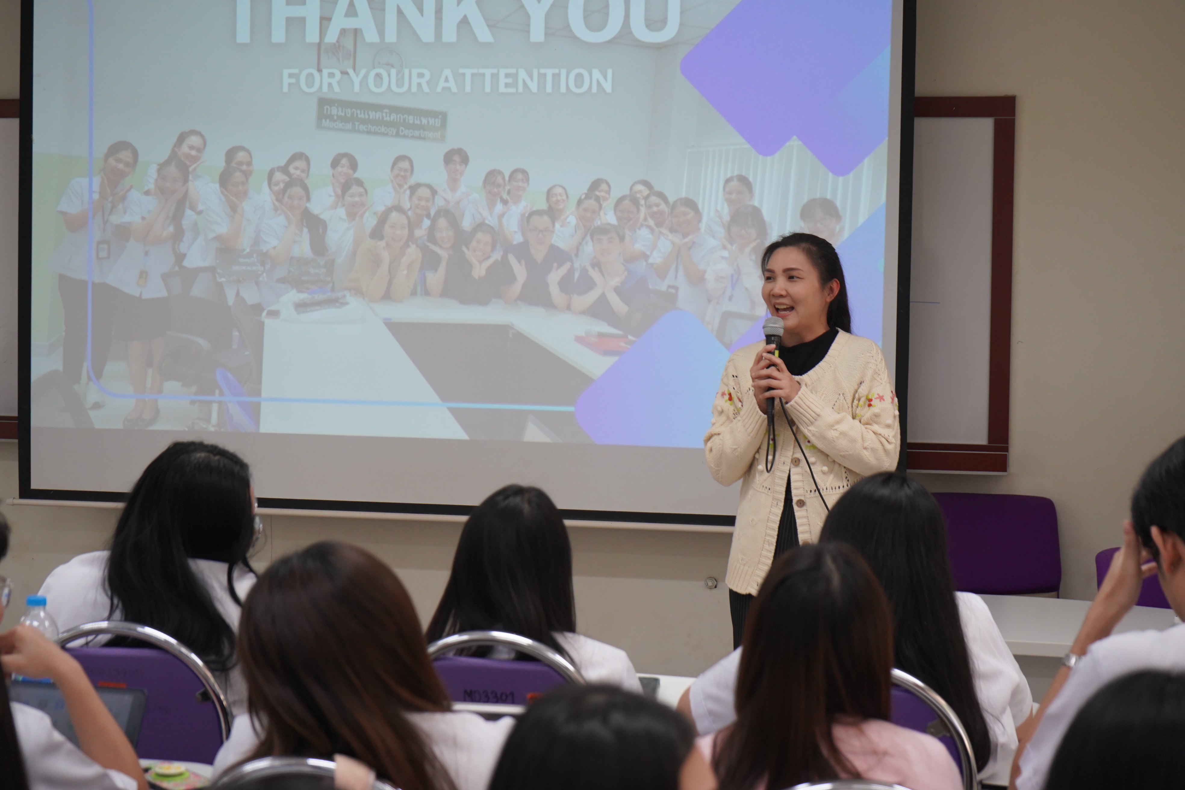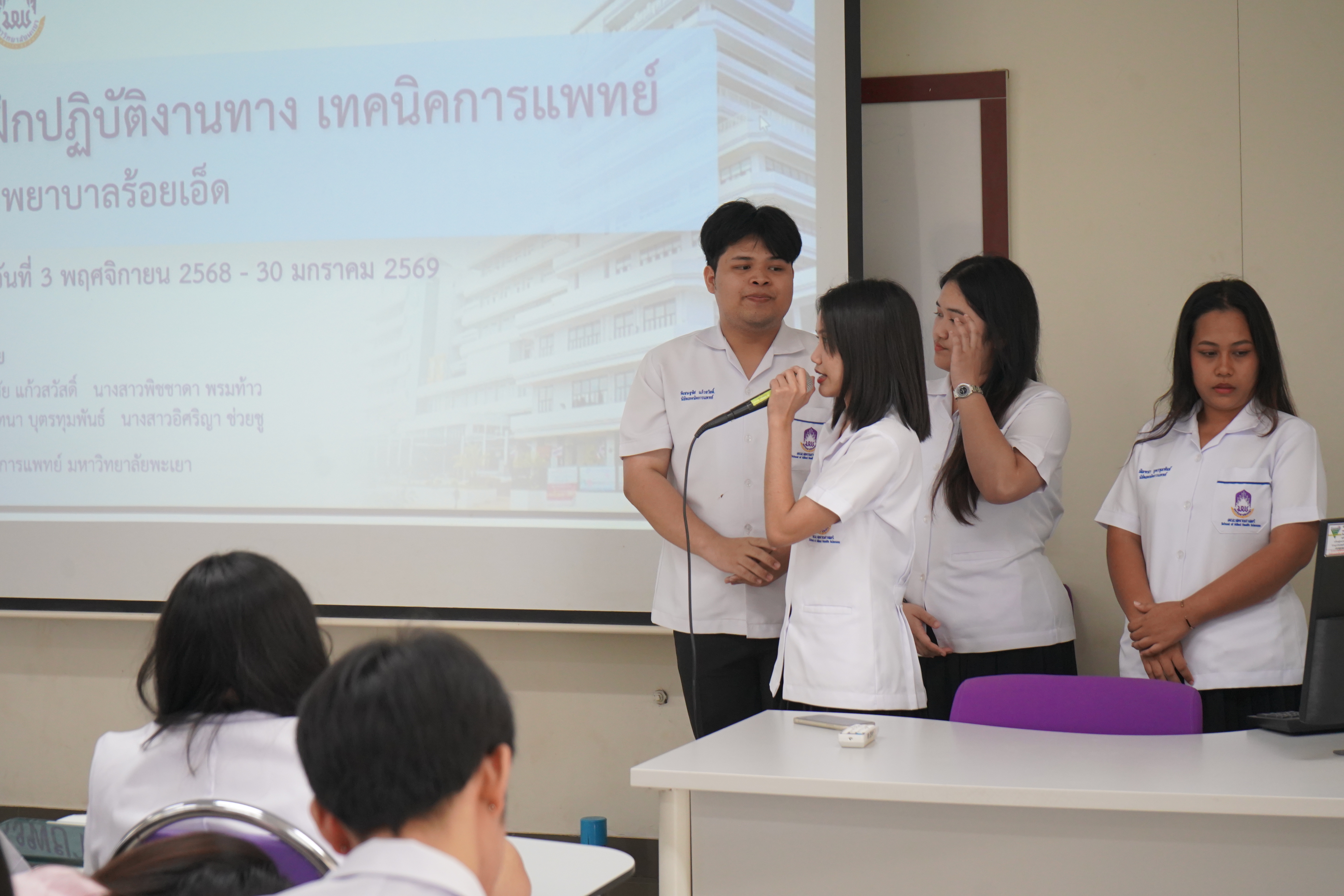 เมื่อวันจันทร์ที่ 16 กุมภาพันธ์ 2569 สาขาวิชาเทคนิคการแพทย์ คณะสหเวชศาสตร์ มหาวิทยาลัยพะเยา ได้จัดกิจกรรม “การนำเสนอผลการฝึกงานทางห้องปฏิบัติการทางการแพทย์ นิสิตชั้นปีที่ 4” ในวันจันทร์ที่ 16 กุมภาพันธ์ 2569 เพื่อเป็นเวทีวิชาการในการสะท้อนผลลัพธ์การเรียนรู้เชิงสมรรถนะ และประเมินความพร้อมก่อนเข้าสู่การประกอบวิชาชีพตามมาตรฐานที่กำหนดโดยหน่วยงานวิชาชีพที่เกี่ยวข้อง โดยมี ผศ.ดร.ณัฏฐพักตร์ ศีลวัตธำรง ทำหน้าที่เป็นผู้ดำเนินกิจกรรม